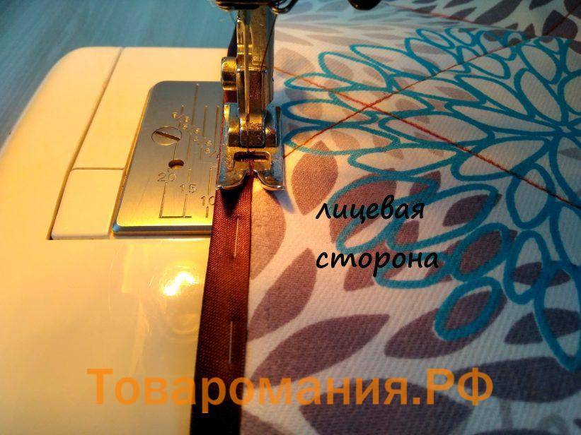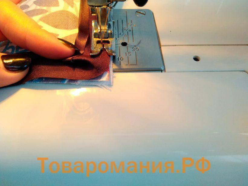Обратите внимание, как я положила ткань по отношению к лапке машинки. Строчка должна проходить на 1 мм
