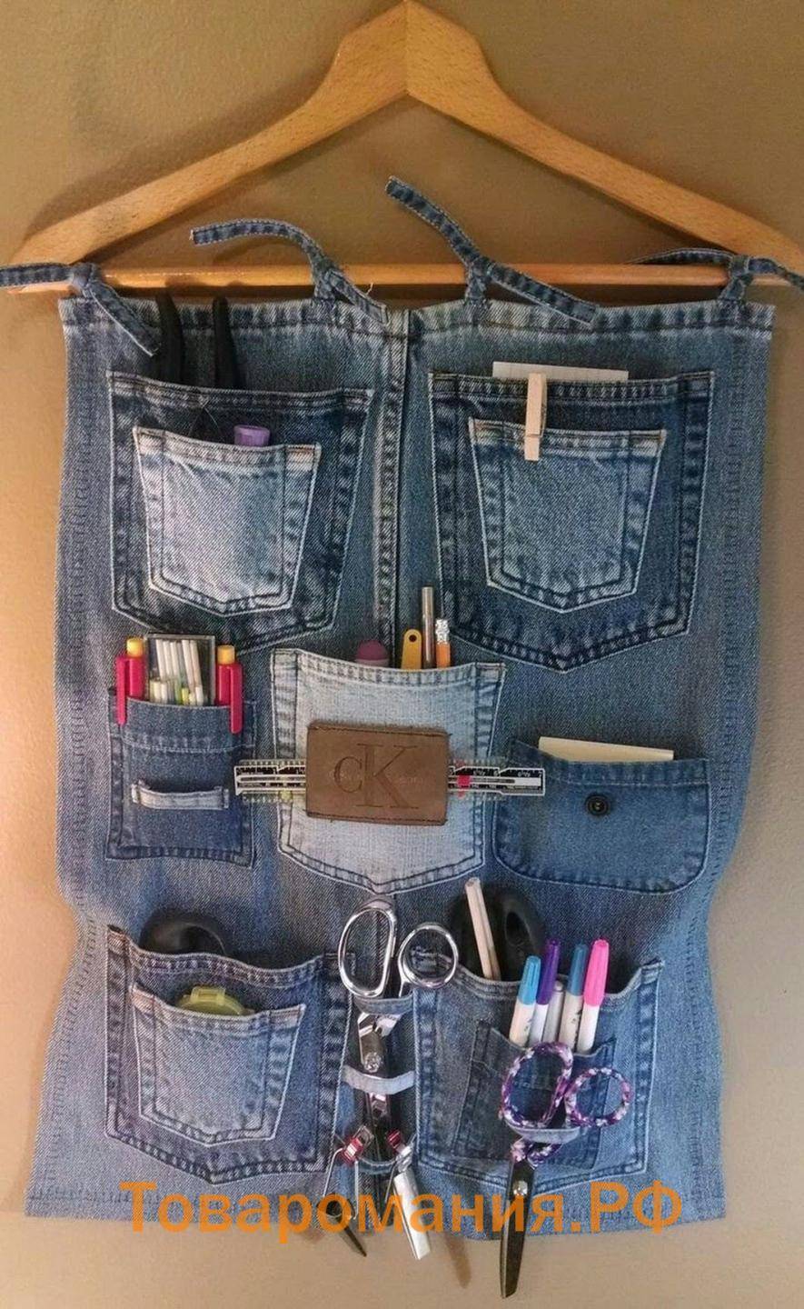 Этот вариант аналогичен тому, который изготавливается для автомобиля. Для него используются отпоротые или срезанные карманы, которые потом нашивают на кусок джинсовой ткани от старых штанов. Помогает такая вещь не только взрослым, но и детям, которые могут не разбрасывать свои игрушки по комнате, а аккуратно сложить в кармашки. Это приучает людей к чистоте и порядку.