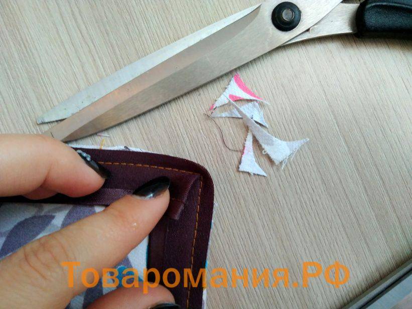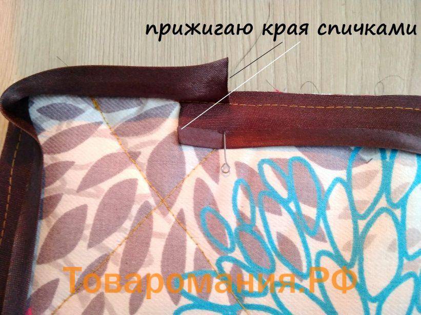 11. Перегибаю косую бейку на лицевую сторону. Пришиваю свободный край бейки к основе органайзера ручными сметочными стежками.