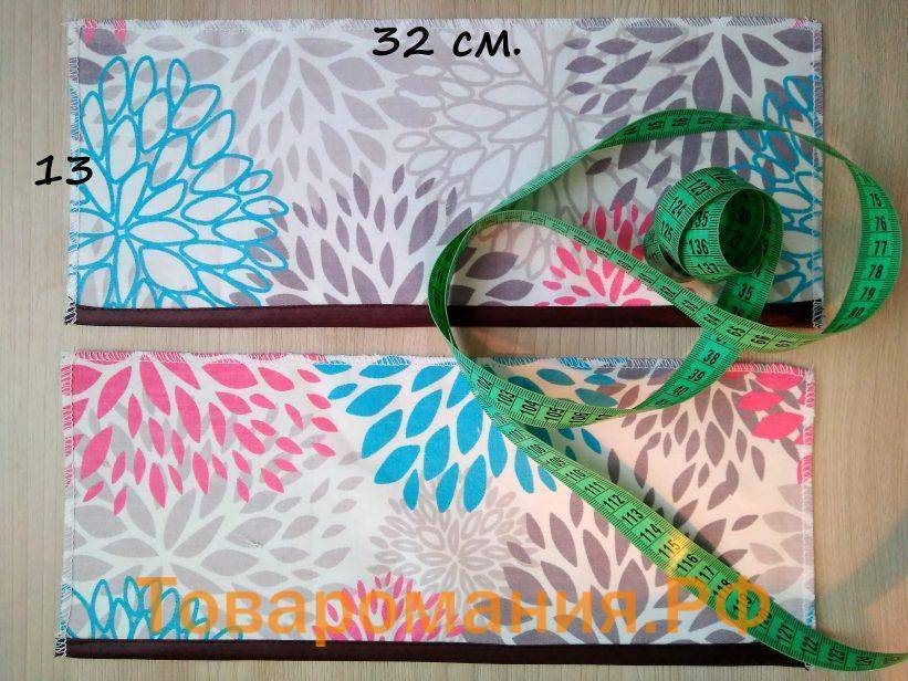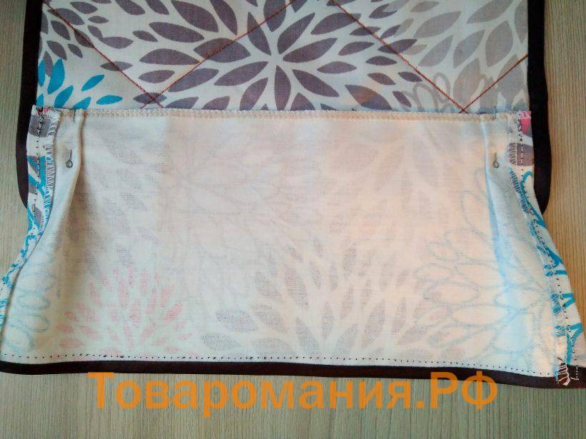 Горизонтально раскладываем ткань и загибаем около 1/3 ее длины. Булавками намечаем, где будут кармашки. По разметке прошиваем заготовку и с каждой стороны кармашка прикрепляем 2 пуговицы. Из лоскутов делаем клапаны, которыми будут закрываться кармашки. Прорезаем отверстия. Клапаны крепим к кармашкам.