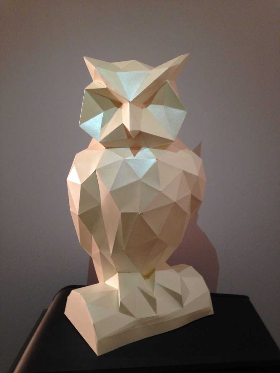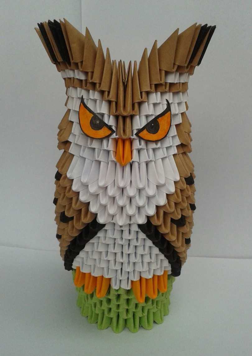 Также можно сделать сову 3Д с растопыренными крыльями. Но это более сложная работа, так как во время сборки основной части нужно по бокам сделать выступы. На них потом собираются из дополнительных модулей крылья.