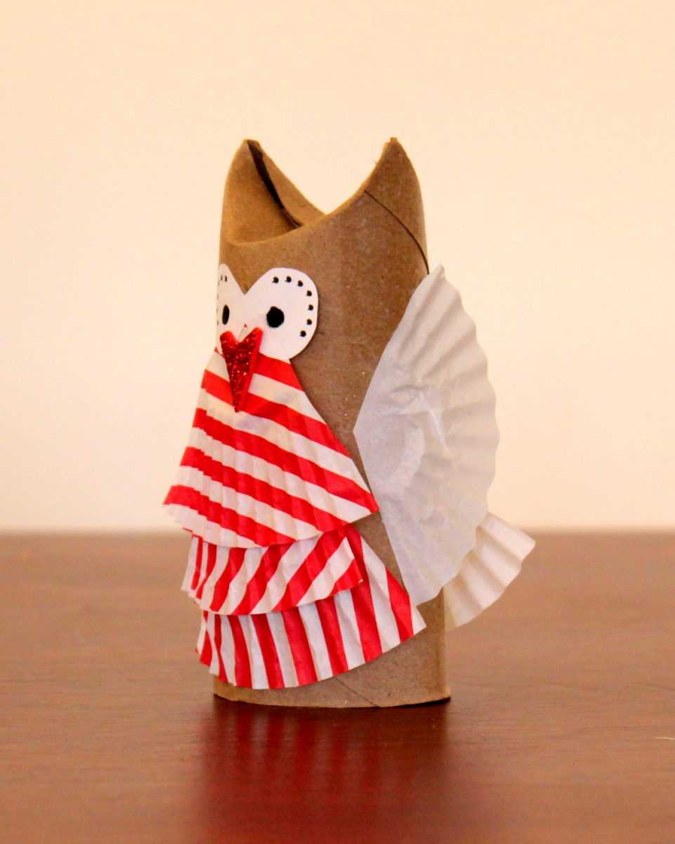 Основной для такой совы является круглый картонный цилиндр, на который наклеиваются все остальные элементы. Здесь огромный простор для фантазии, вариантов отделки можно придумать сколько угодно. Рассмотрим один из них.