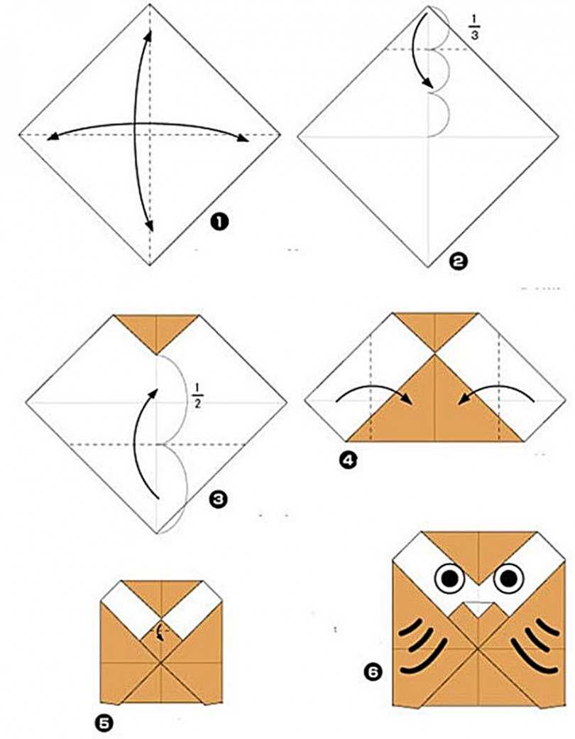 Простые совы получаются по стандартным схемам или состоят из модулей (маленьких деталей, которые собирают вместе как пазл). В интернете можно найти множество несложных описаний оригами сов. Одна из самых элементарных схем приведена ниже. Следуйте пошаговой инструкции, и вы легко сделаете сову для вашего малыша.