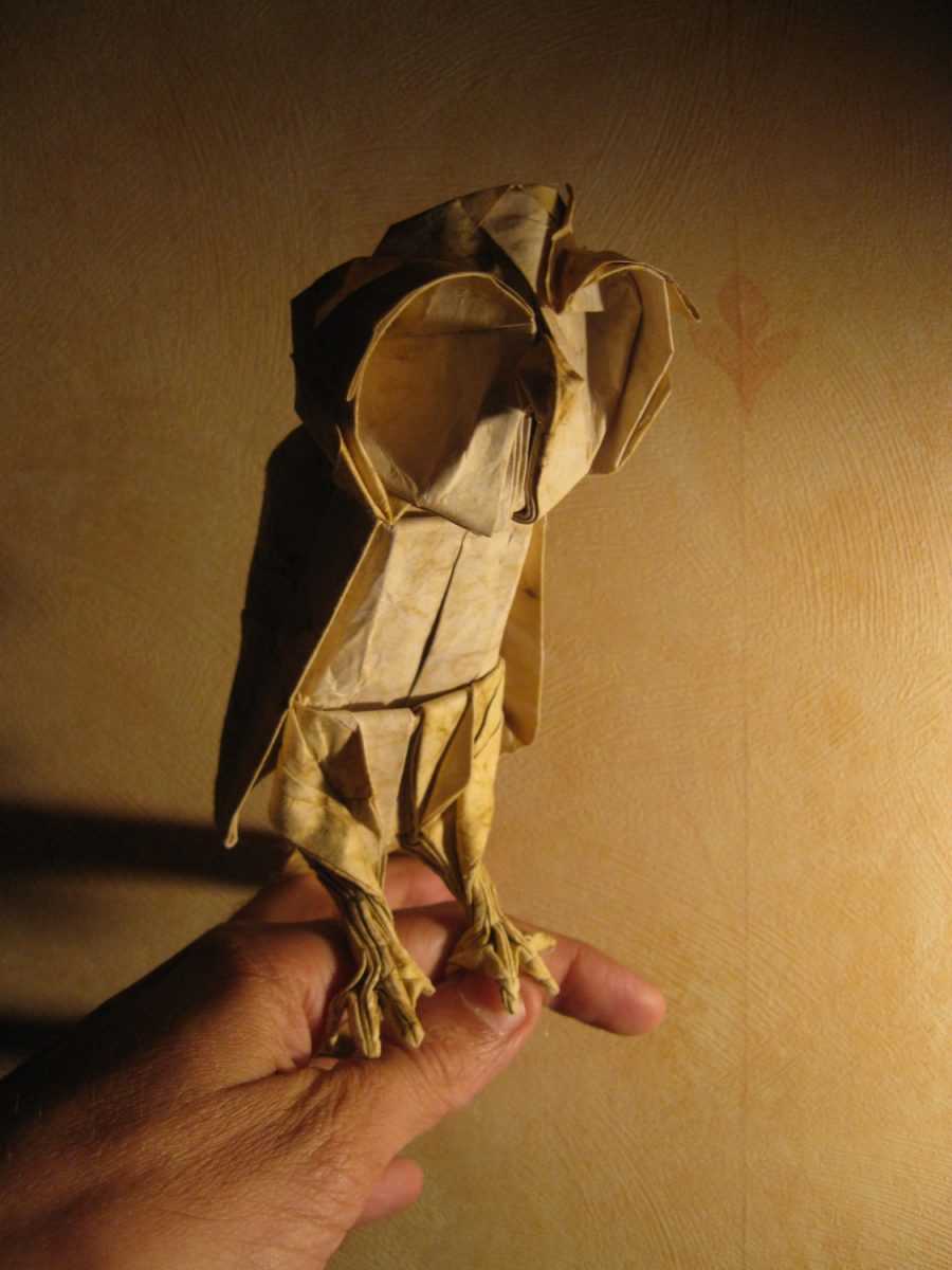 Нижний уголок немного разрежьте и сделайте небольшую складку, подогнув лапки совушке. Основная работа завершена.