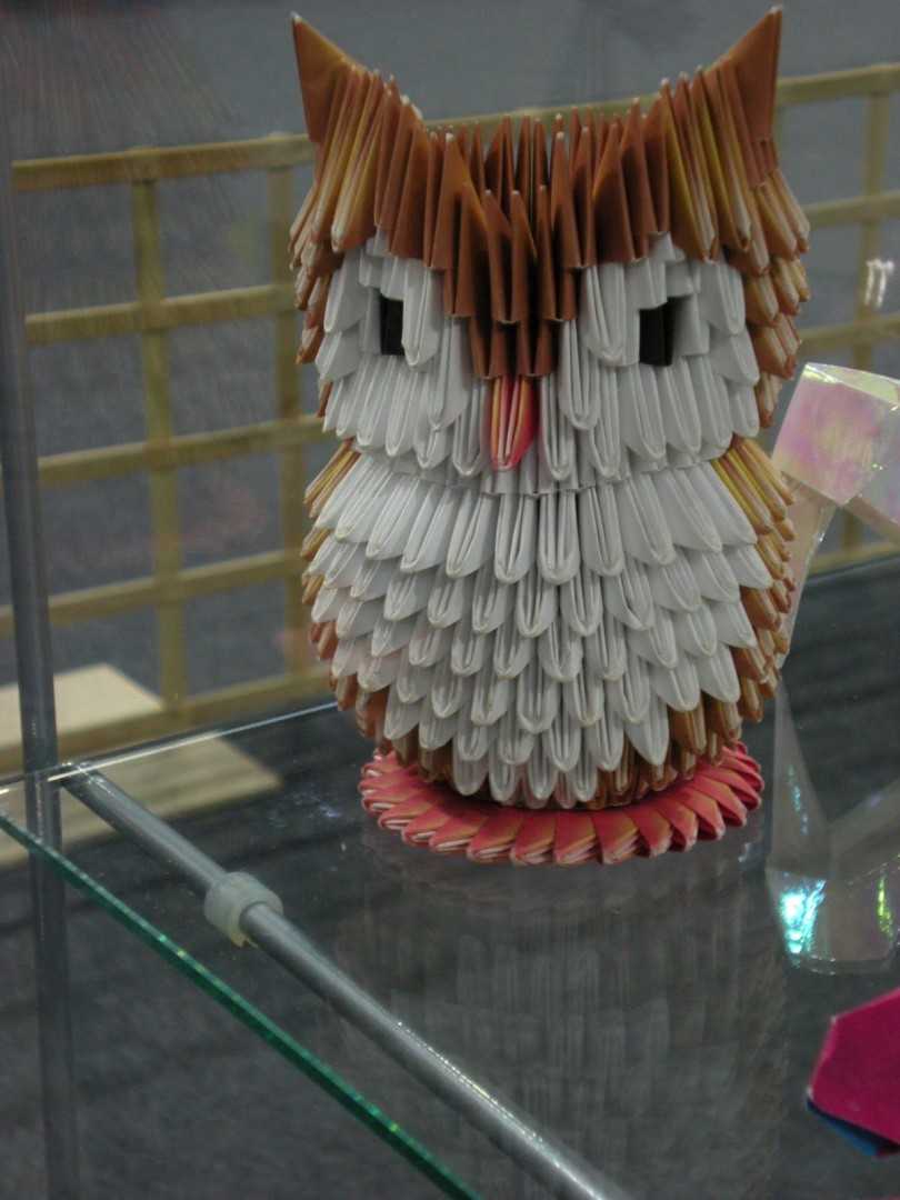 Например, можно сделать такую поделку – сову с ушками, как на картинке выше. Для этого возьмите всего два цвета для создания модулей. Во время создания первых двух рядов уже учитывайте, что у вашей поделки будет выделен животик. Поэтому сначала соберите несколько модулей цвета А, а потом дополните цветом В. Так соедините полностью фигуру, напоминающую яйцо. По бокам сверху в конце прикрепите пару моделей, которые будут изображать ушки. А из бумаги вырежьте глазки и приклейте на готовую поделку.