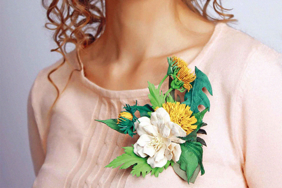 Можно на основе этих делать и другие украшения из кожи своими руками. Изготовьте несколько, только очень мелких объемных цветов, как для броши. При помощи маленьких шпилек с бусинами закрепите их на цепочке. У вас получится ещё одно изумительное колье.