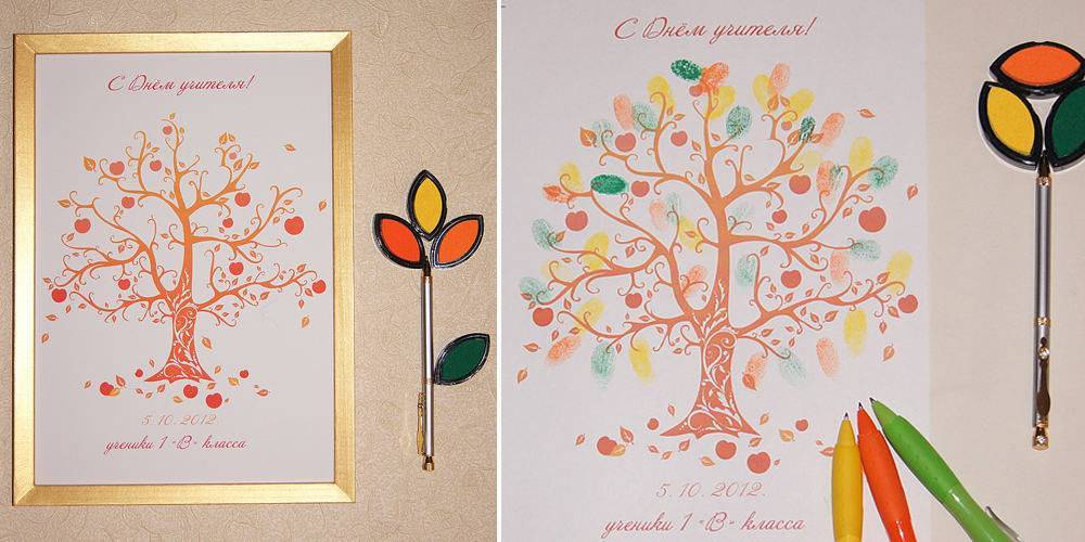 Каждый из учеников должен мокнуть пальчик в краску и поставить свой отпечаток на ветке дерева, а после этого написать пожелание своим почерком.