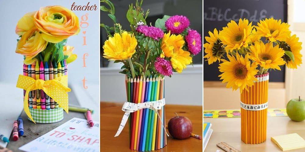 В вазу ставим нечетное количество живых или искусственных цветов. Если вы хотите подарить учительнице живые цветы, то, чтобы они дольше стояли, можно применить следующую хитрость: на дно баночки приклеиваем небольшой стеклянный или плотный пластиковый стаканчик, в котором будет вода для цветов. Мы рекомендуем наполнить его только после того, как ваза подарена, чтобы не испортить праздничный наряд учителя