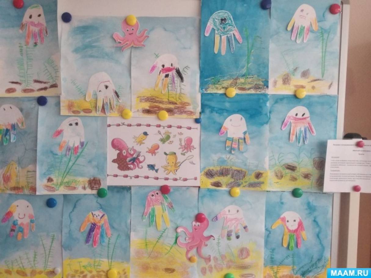 – Давайте поможем папе осьминогу найти своих деток. Поможем? Нам ребята, предстоит раскрасить осьминожков, чтобы папа смог их найти. Наши ручки нам уже много раз помогали. Сегодня я покажу вам как ладошками нарисовать осьминожков. Но прежде чем приступить к работе, нам надо сделать морскую зарядку.