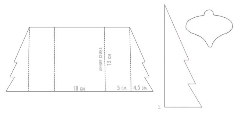 - Из гофрированного картона вырежьте четыре половинки будущей елочки (две правых стороны и две левых), треугольник, елочный шарик, прямоугольную полоску — 13 на 2 сантиметра и прямоугольник 12 на 9.