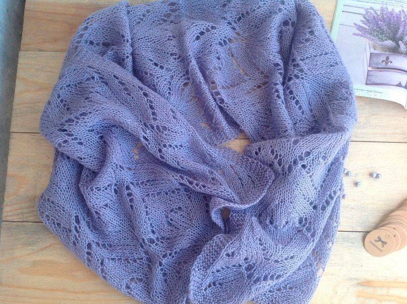 Вяжется шаль спицами, а пряжу выбирайте для летней шали – хлопок или лен, а для теплого варианта – шерсть, мохер.