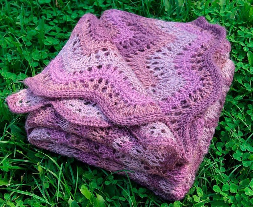 Безумно красивая шаль Клематис имеет полукруглую форму. Ее не назовешь легким вариантом шали, но разобравшись как связать шаль Клематис спицами, вы получите изумительную деталь гардероба.