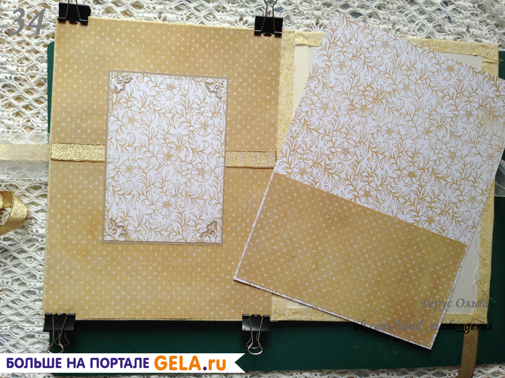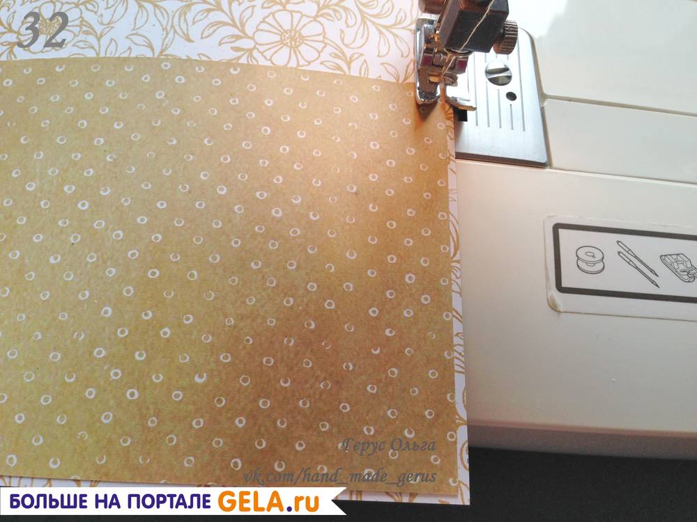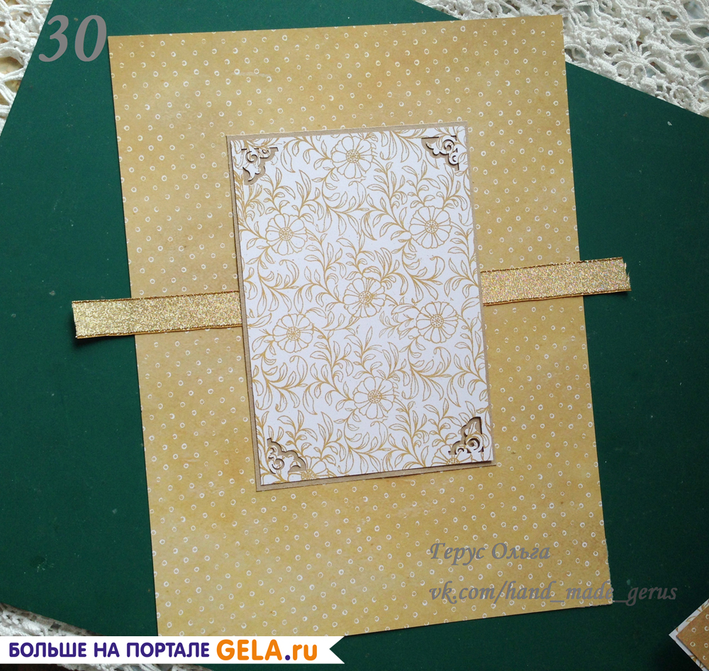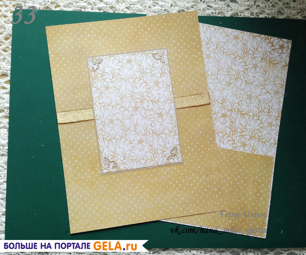 30-33. Приклеиваем подложку для фотографии, добавляем золотистую ленту поперек по центру слева и карман – справа. Прошиваем для дополнительной прочности на швейной машинке. Внутреннее оформление папки готово!