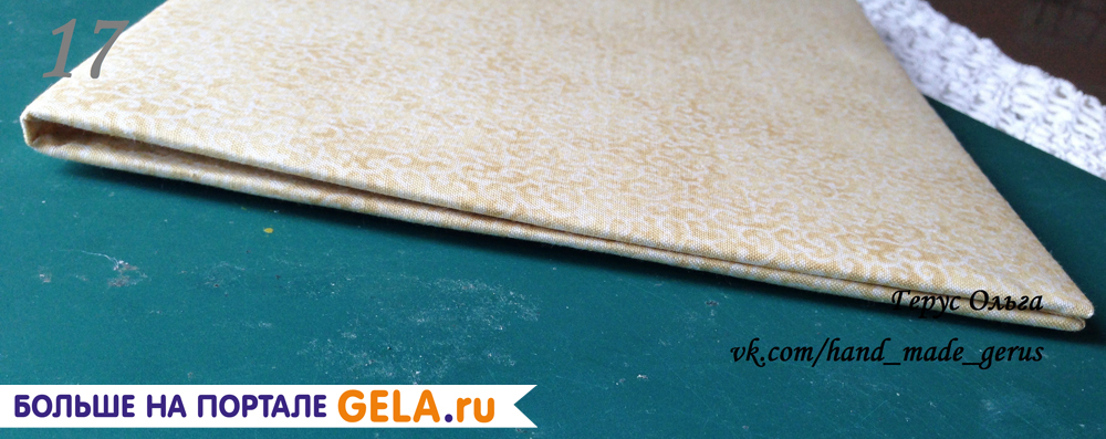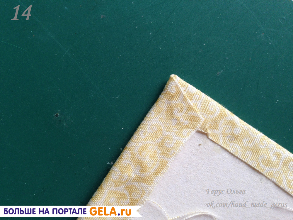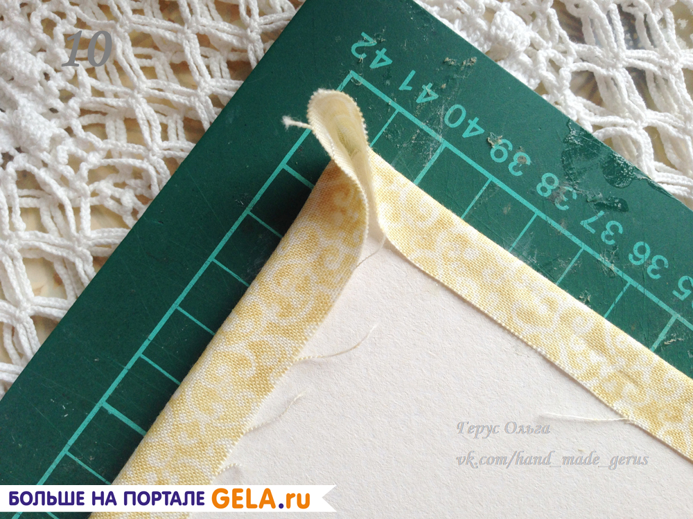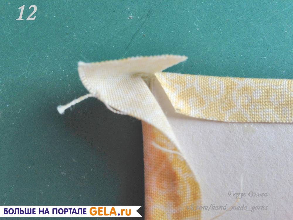 9. Сначала приклеиваем стороны, немного натягивая ткань на картон. Уголки на этом этапе не трогаем: