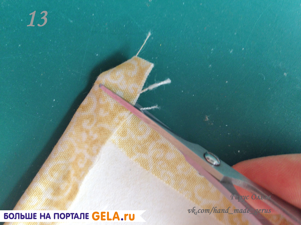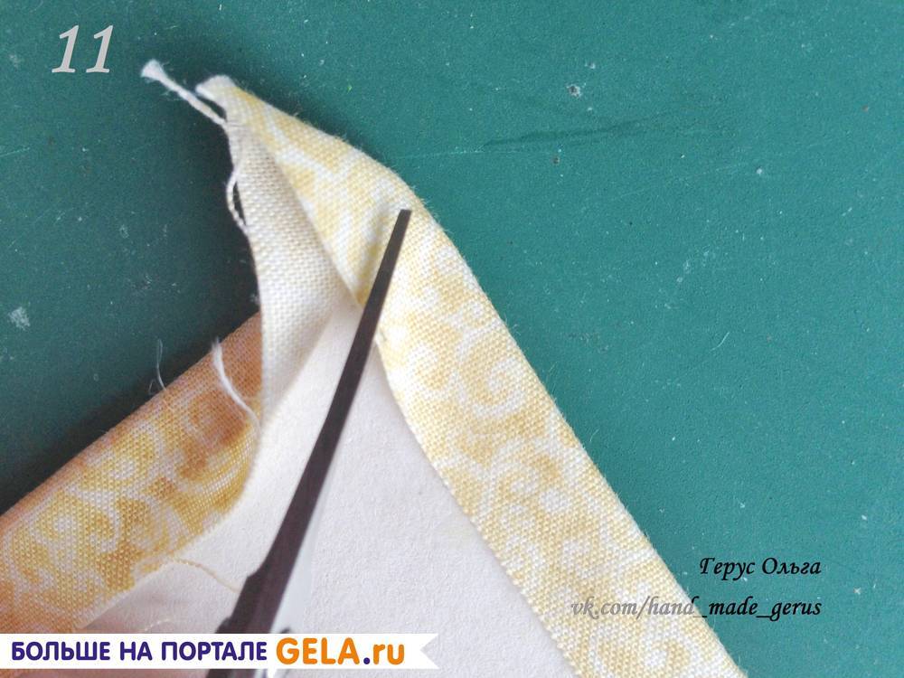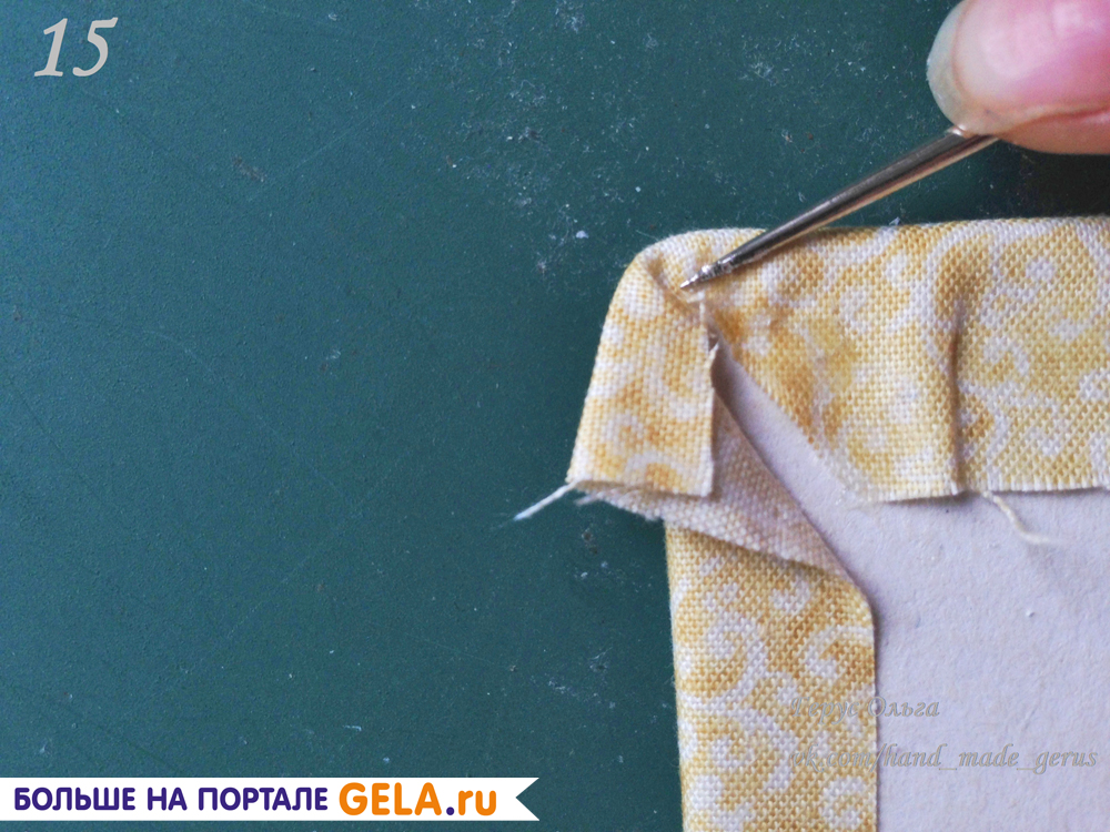 15. Наносим каплю клея на картон, с помощью шила загибаем серединку уголка ткани внутрь: