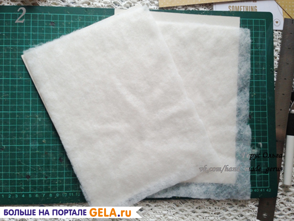 3. Следующим шагом на обложку крепится синтепон. Синтепон необходимо приклеивать с помощью клея-карандаша.