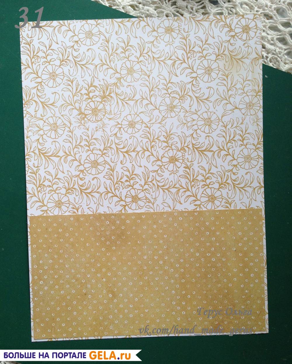 27. Приступаем к оформлению внутренней части папки: слева будет место для фотографии, а справа – карман для документа.Вырезаем изскрап бумаги два прямоугольника размером 19,5/26,5.