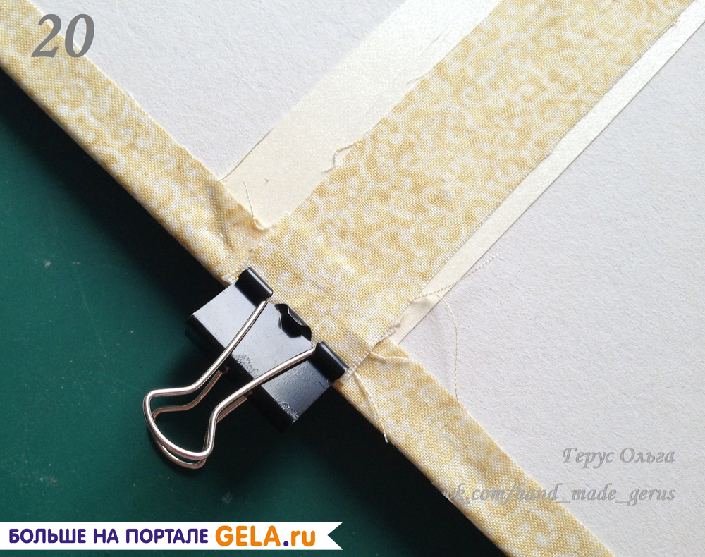 20. Ровно приклеиваем с помощью клея карандаша нашу подготовленную полоску ткани на сгиб внутренней стороны папки. Несколько раз открываем и закрываем папку, чтобы сформировать сгибы: