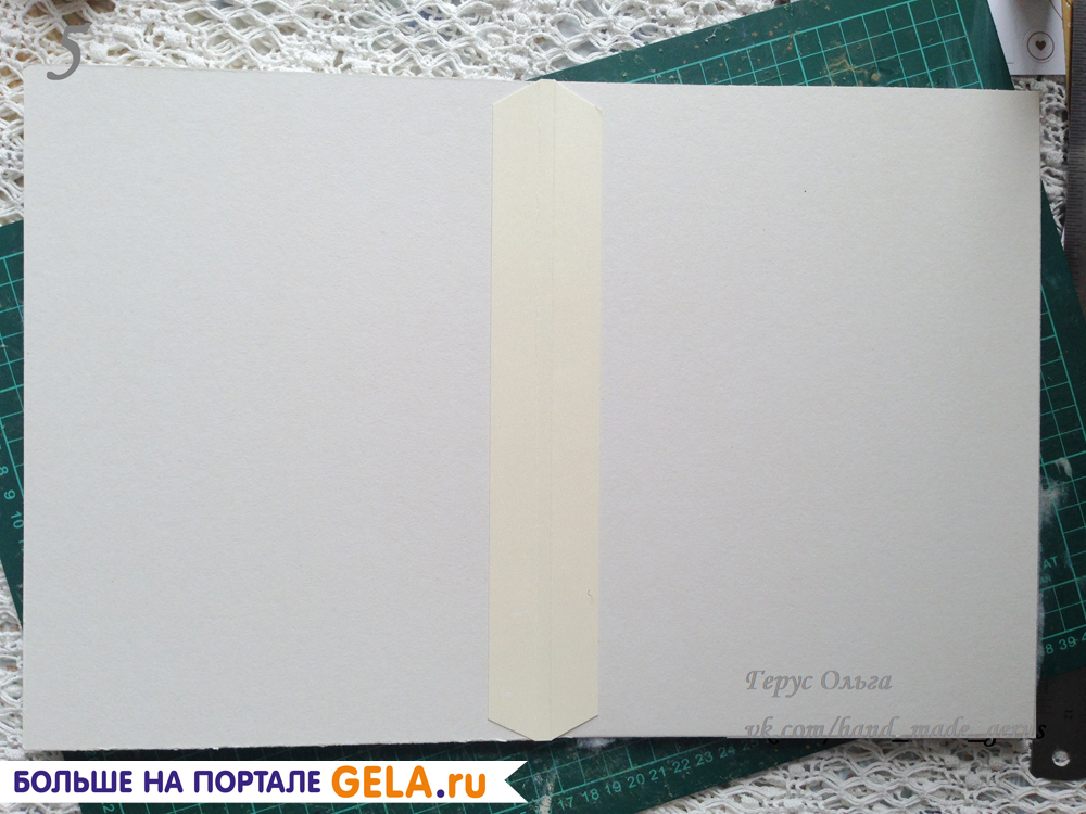 2. Далее создаем корешок из картона. На этапе заготовки необходимо создать линии сгиба. Корешок приклеиваем к основам и таким образом получаем заготовку в виде книги.