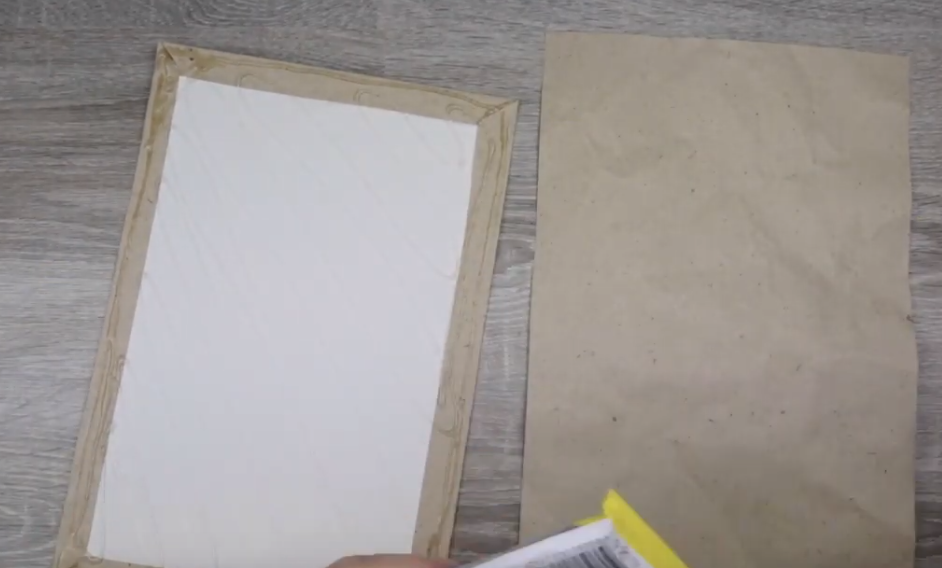 - Края крафт-бумаги подворачиваем внутрь и приклеиваем к картону, углы подрезаем под 45°.