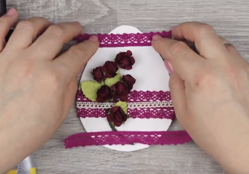 - К яйцу приклеиваем две полоски яркой кружевной ленты.