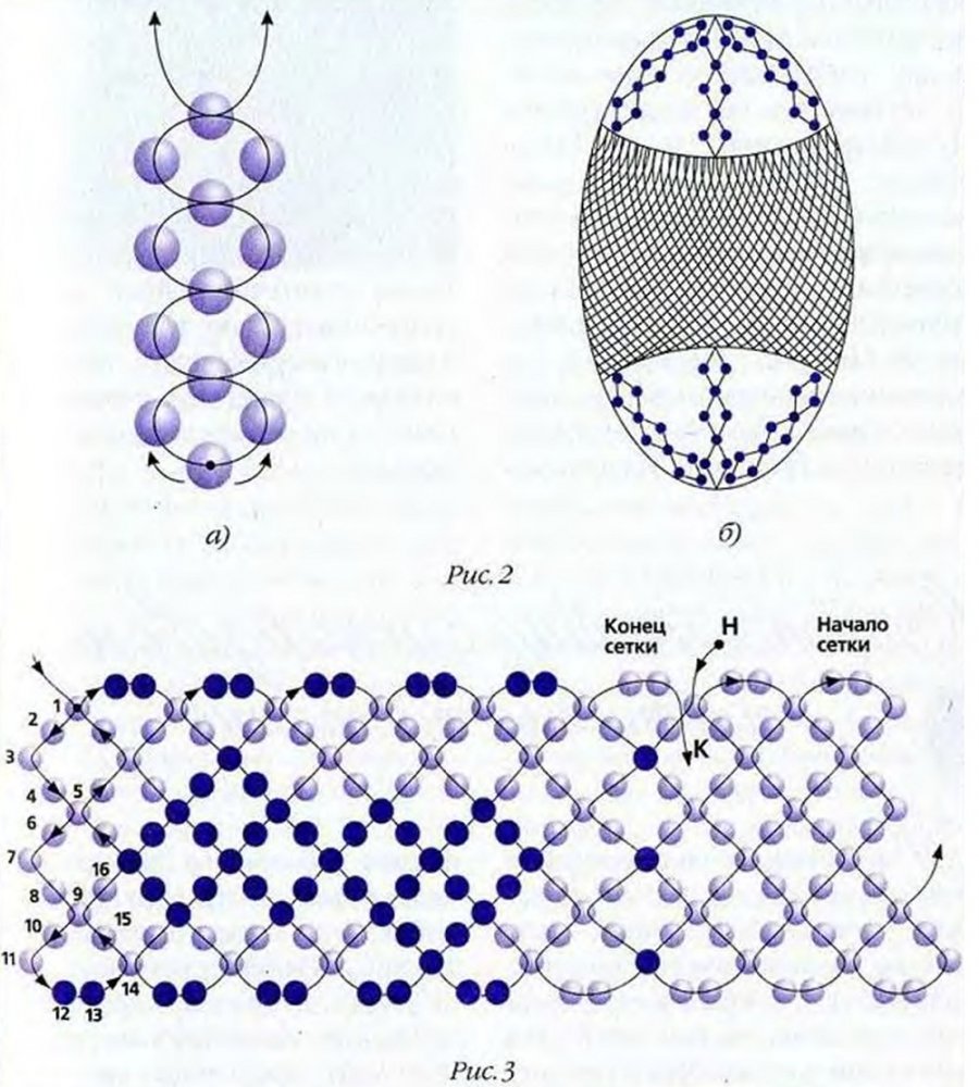 Сплетите поясок ажурной сеточкой на три ромба (начальный набор шестнадцать бисерин) со стороной ромба в три бисерины (рис. 1). Замкните поясок в кольцо. Он должен иметь в окружности четное число ромбов и очень плотно облегать заготовку (рис. 2). В нашем случае это сорок ромбов.