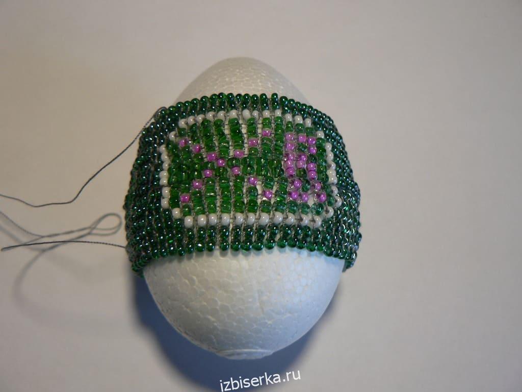 - Таким поясом обхватывают яйцо, и плетут сужающие зоны. Делается это по тому же принципу, только берется не 5, а 3 бусинки.