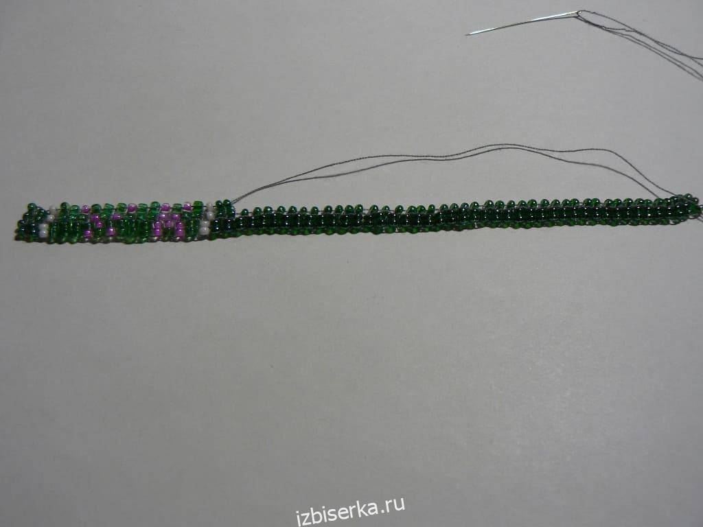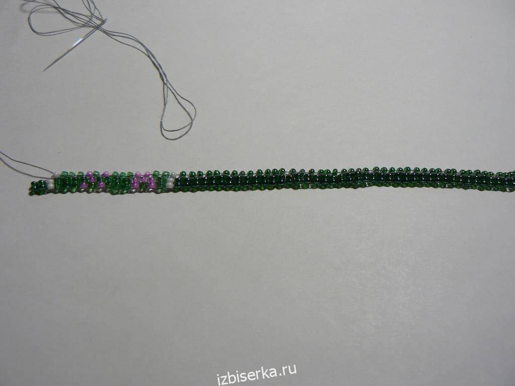 - Берем следующий бисер, сверяясь с цветовой схемой, и присоединяем способом, указанным в п.3 и п.4. Набираем поочередно: белый, два светло-зеленых, два розовых, три светло-зеленых, розовый, светло-зеленый, розовый, три светло-зеленых, белый и далее темно-зеленый до завершения узора.