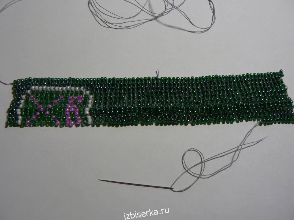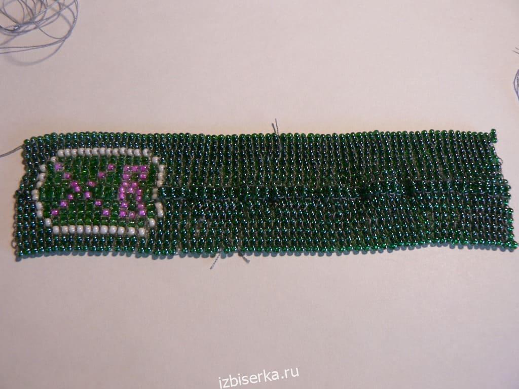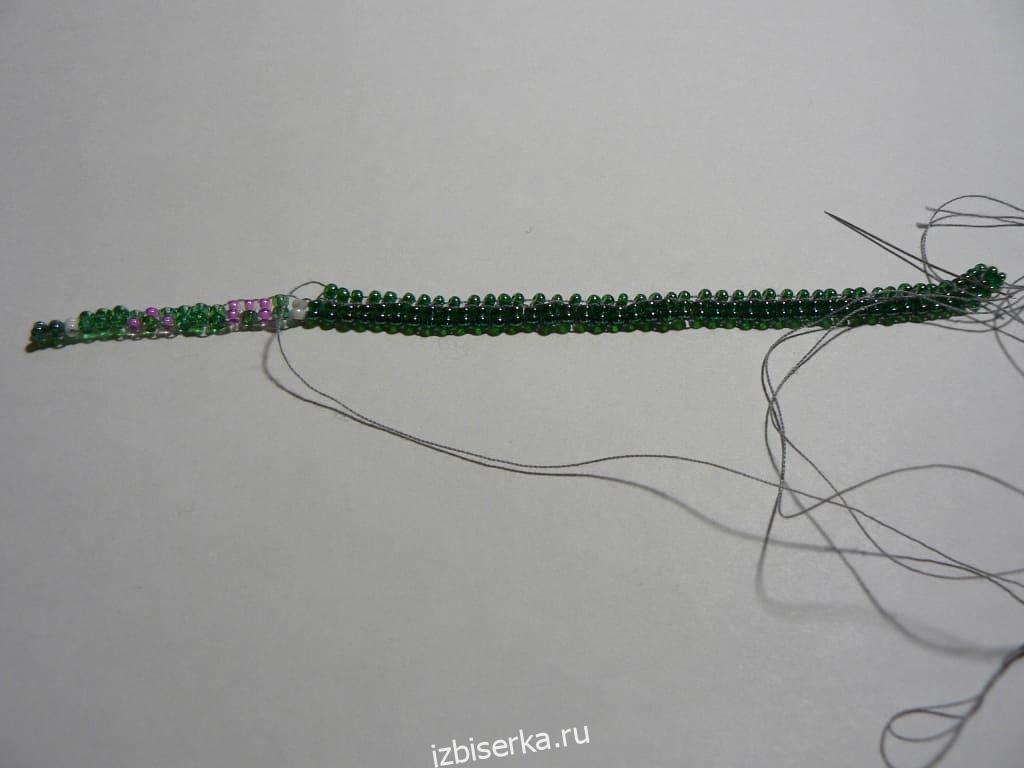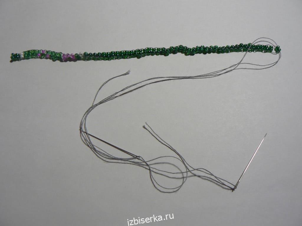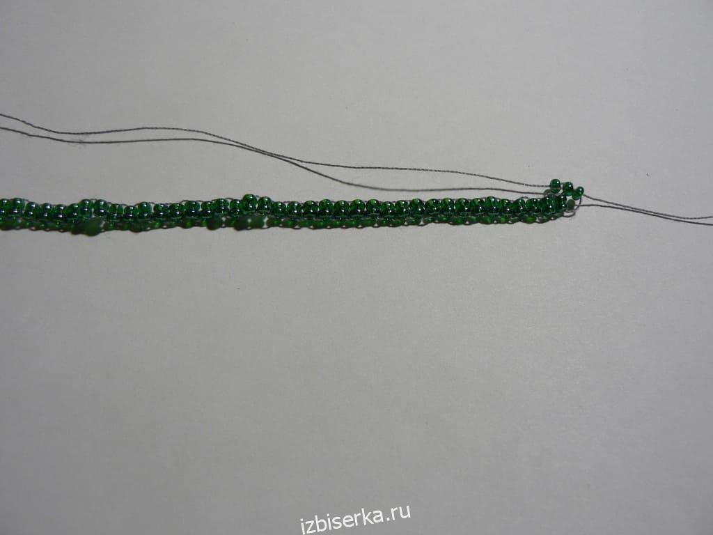 - Следующий шаг: опять проходим иглой с нитью в первый бисер следующего ряда. Работаем с темно-зеленым бисером до начала рисунка.