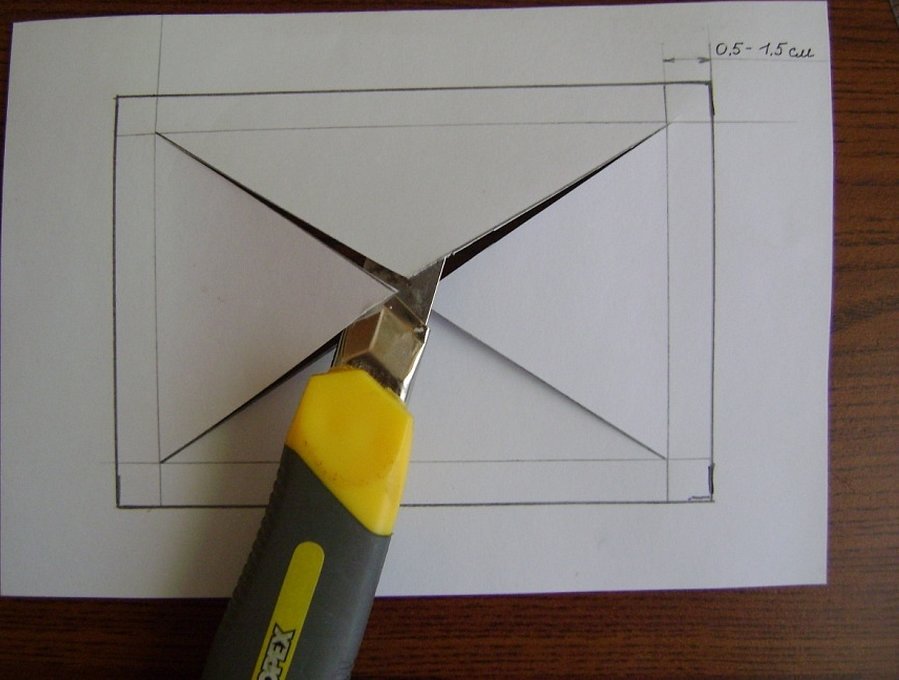 - Далее от углов прямоугольника чертим две диагональных линии, получается 4 треугольника. Так же по линиям разрезаем канцелярским ножом заготовку.
