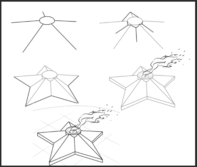 В центре листа поэтапно рисуют два прямоугольника в виде ступеней, сверху – треугольный обелиск, украшенный красной звездой. К памятнику пририсовывают вымощенную камнями дорожку, рядом – траву, деревья. Дополнить картину можно букетами цветов.