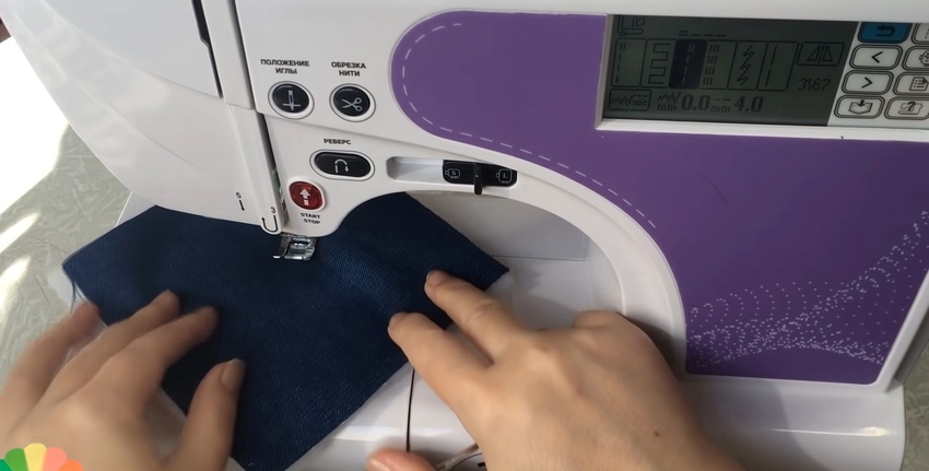 | 7 | ![]() | Свободный край цветной детали дважды подогните и прострочите. Для удобства можете зафиксировать эту область булавками. Подобным образом вшейте все джинсовые заготовки, заворачивая и прошивая кромку со всех сторон. |