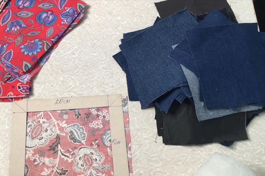 | 1 | ![]() | Для начала подготовьте квадраты, вырезанные из синтепона, старых джинсов размером 15*15 см и цветной ткани (20*20 см). Желательно использовать трафарет из плотной бумаги, чтобы было быстрее и удобнее делать заготовки. |