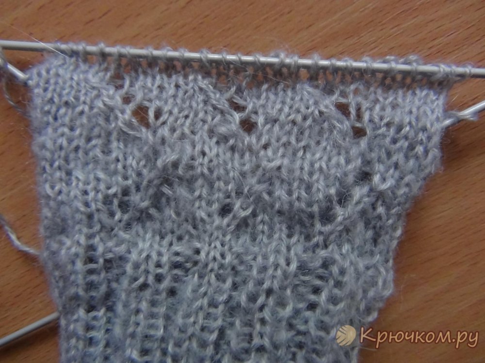 В 24м ряду – 5 л/п, 2 л/п вместе с наклоном вправо, Н., 4л/п, 2 вместе л/п в наклоном вправо, Н, 4 л/п, 2 вместе с наклоном вправо, Н., 5 л/п; затем 24 л/п.