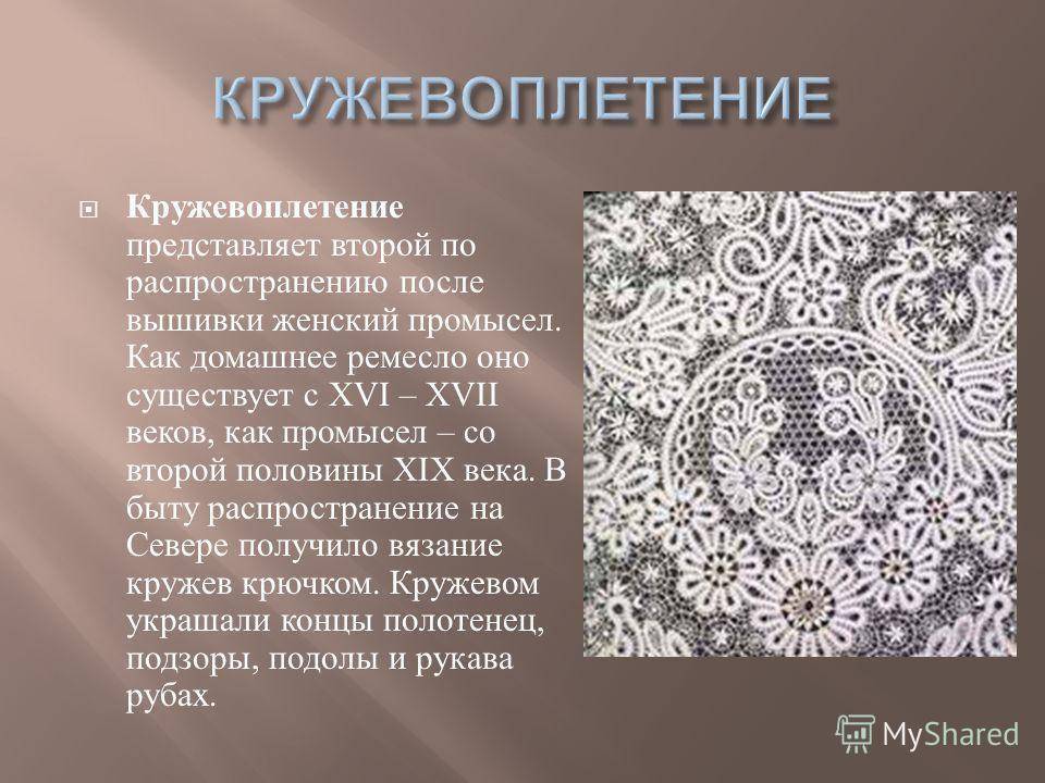 Кружевоплетение представляет второй по распространению после вышивки женский промысел. Как домашнее ремесло оно существует с XVI – XVII веков, как промысел – со второй половины XIX века. В быту распространение на Севере получило вязание кружев крючком. Кружевом украшали концы полотенец, подзоры, подолы и рукава рубах.