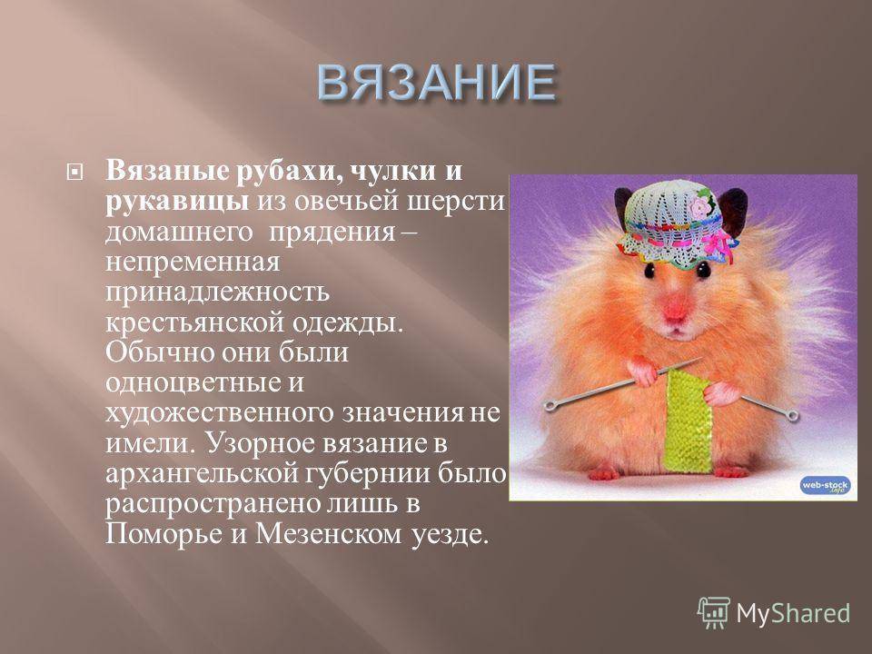 Вязаные рубахи, чулки и рукавицы из овечьей шерсти домашнего прядения – непременная принадлежность крестьянской одежды. Обычно они были одноцветные и художественного значения не имели. Узорное вязание в архангельской губернии было распространено лишь в Поморье и Мезенском уезде.