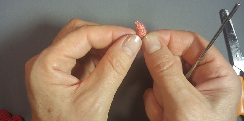 - Наметьте место для клювика и провяжите по кругу (петель не должно быть очень много – их диаметр не более одного сантиметра). Потом вяжем и дальше по кругу, но уже убавляя петли и закрепляя нить в конце. Провяжите под клювиком и бородку.