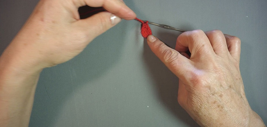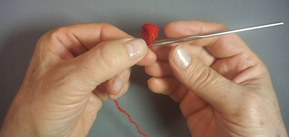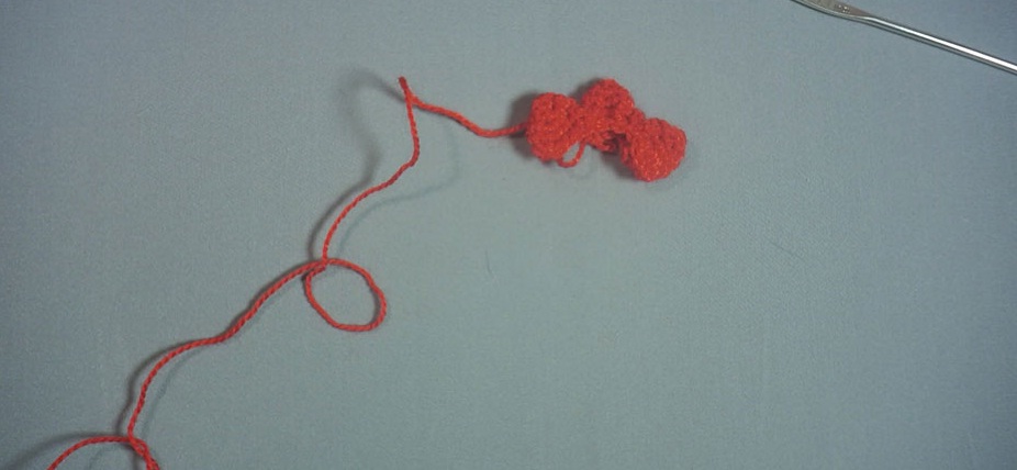 Нитью красного цвета набираем 8вп, заводим крючок в третью петлю, вывязываем из нее 7 полустолбиков с накидами, оставшиеся 5п провязываем соединительными столбиками. Далее, провязываем 6вп, из третьей вывязываем 7псн, оставшиеся 3сс.