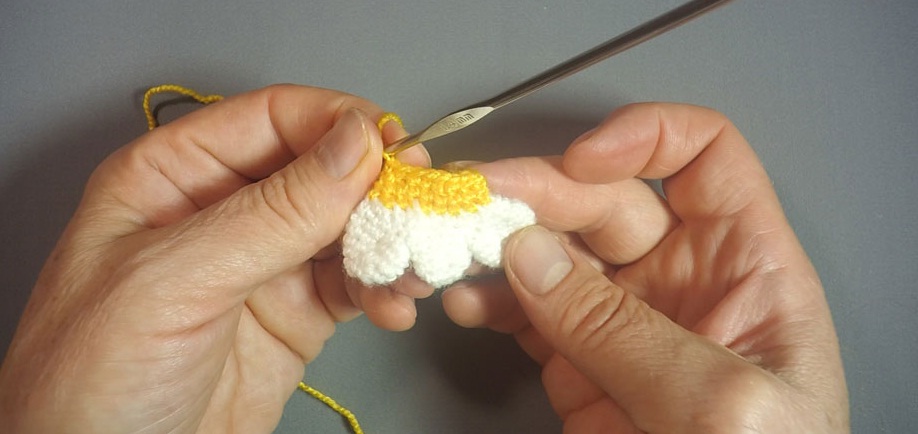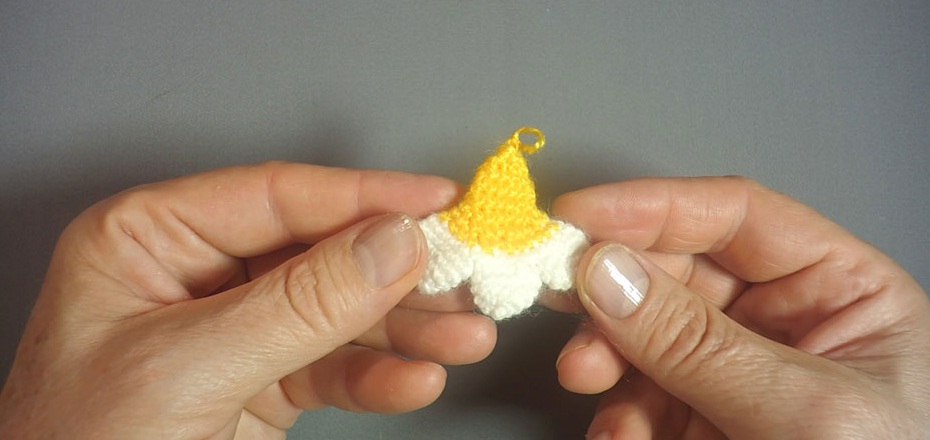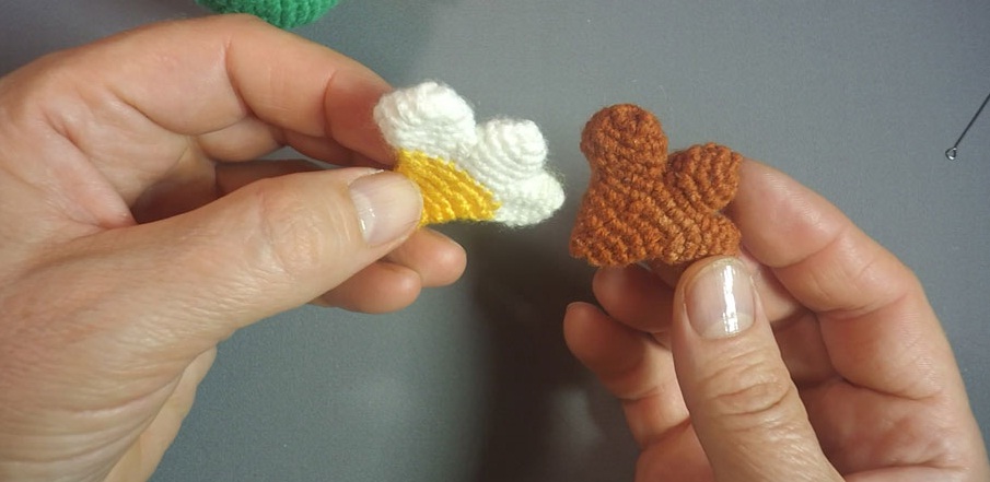 - необходимо соединить 4 столбика первой детали, петельку первой детали и петельку второй летали столбиком без накида;