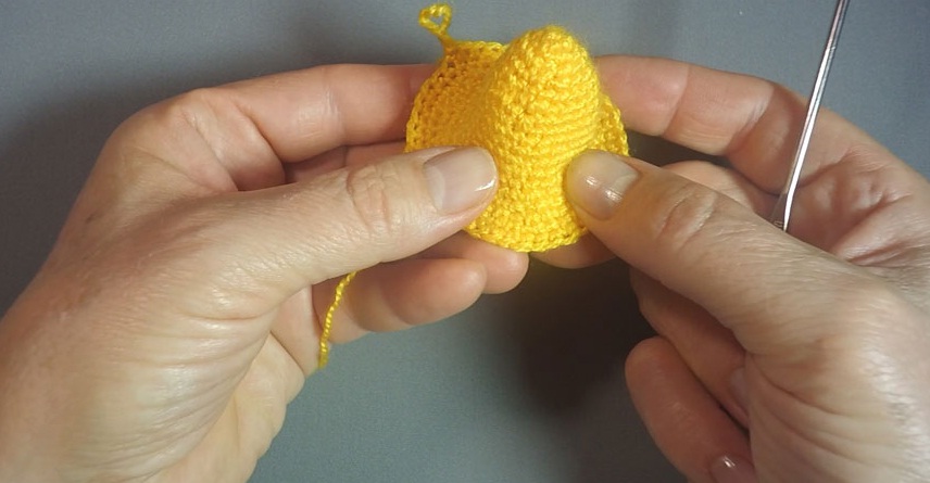 - количество петель уменьшаем до одной. Нить необходимо прочно затянуть. Также нужно оставить кусок нити достаточной длины. При ее помощи крылья будем пришивать к туловищу.