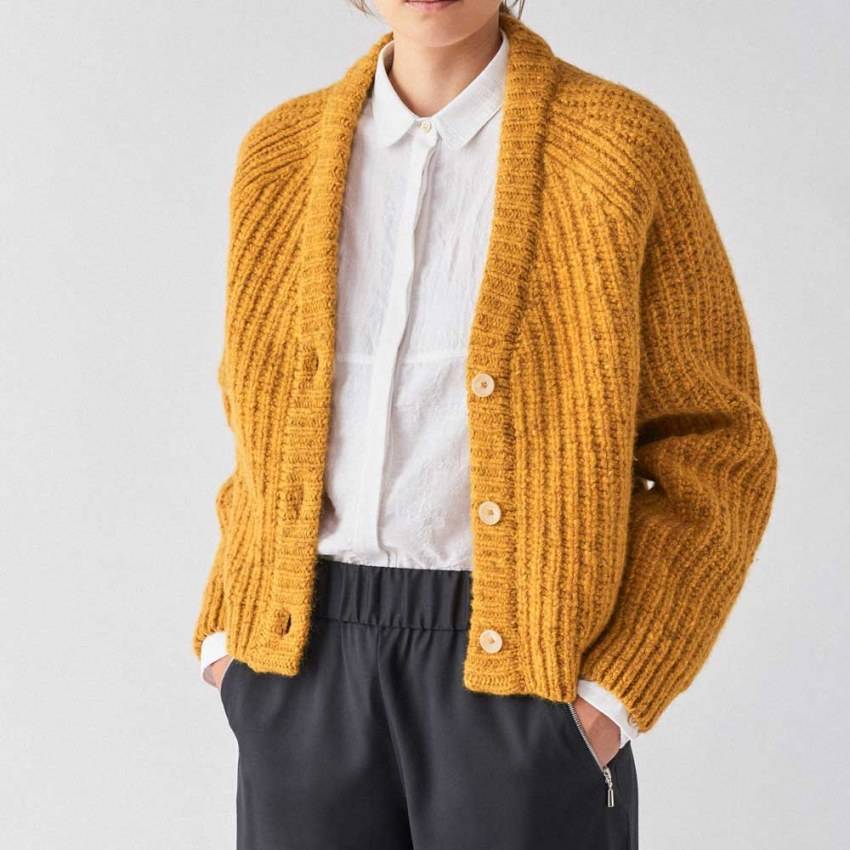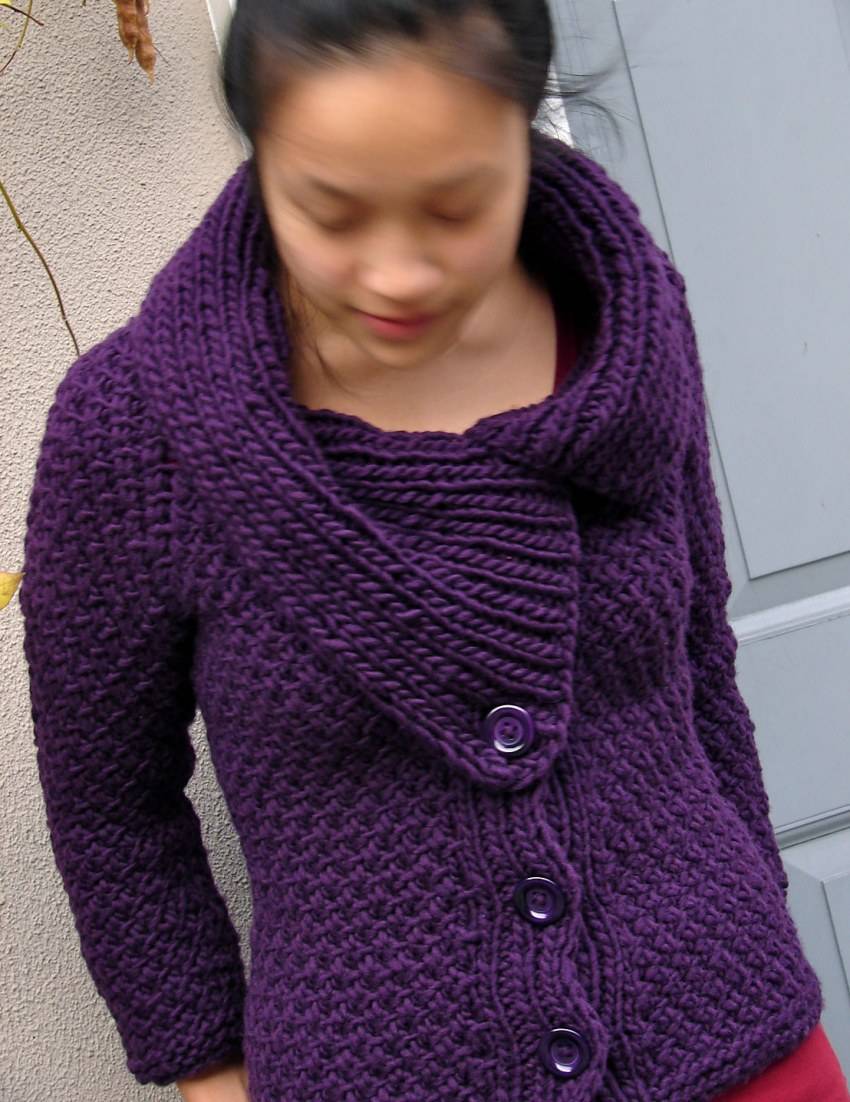 - Теплый объемный жакет с широким, связанным спицами воротником-шалькой станет любимой вещью надолго.