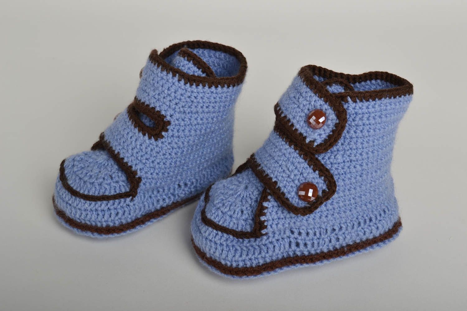 Детские ботиночки, связанные спицами, декорируются бубонами, ажурной вязкой, косами. Привлекательно выглядят украшения в виде вышивки, рюшей, аппликаций, пуговичек, атласных лент, бусинок, помпонов, шнуровки и других элементов.