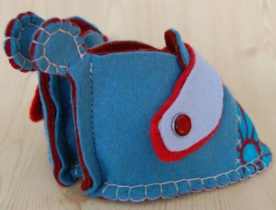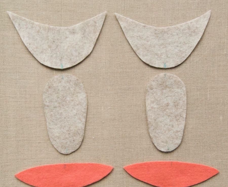 Сперва сделайте выкройку пинеток по трафарету. Сначала лучше перенесите рисунок на бумагу, чтобы не чертить лишних линий на фетре. Вырезаем, складываем, сшиваем. Затем даем волю фантазии: нужно сделать мордочку нашим самодельным детским пинеткам. Кошачью, лисью, заячью… — воля ваша! Носик и глазки лучше тоже сделать из фетра и пришить. Бусины тут нам ни к чему, клей тоже.