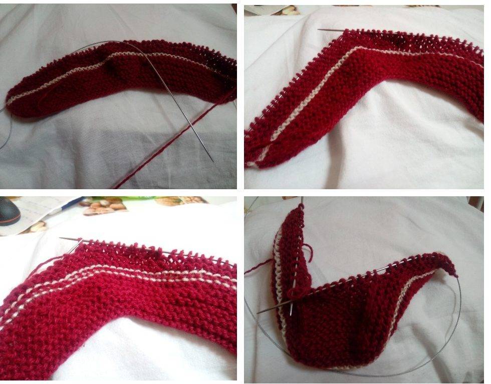 8 ряд продолжаем платочной вязкой. На 9 ряду нас ждет последняя прибавочка. Отличие от 7 ряда: вместо 2 петель после начальной и перед финишной кромочной вяжем 3 лицевых, а в середине ряда 8.
