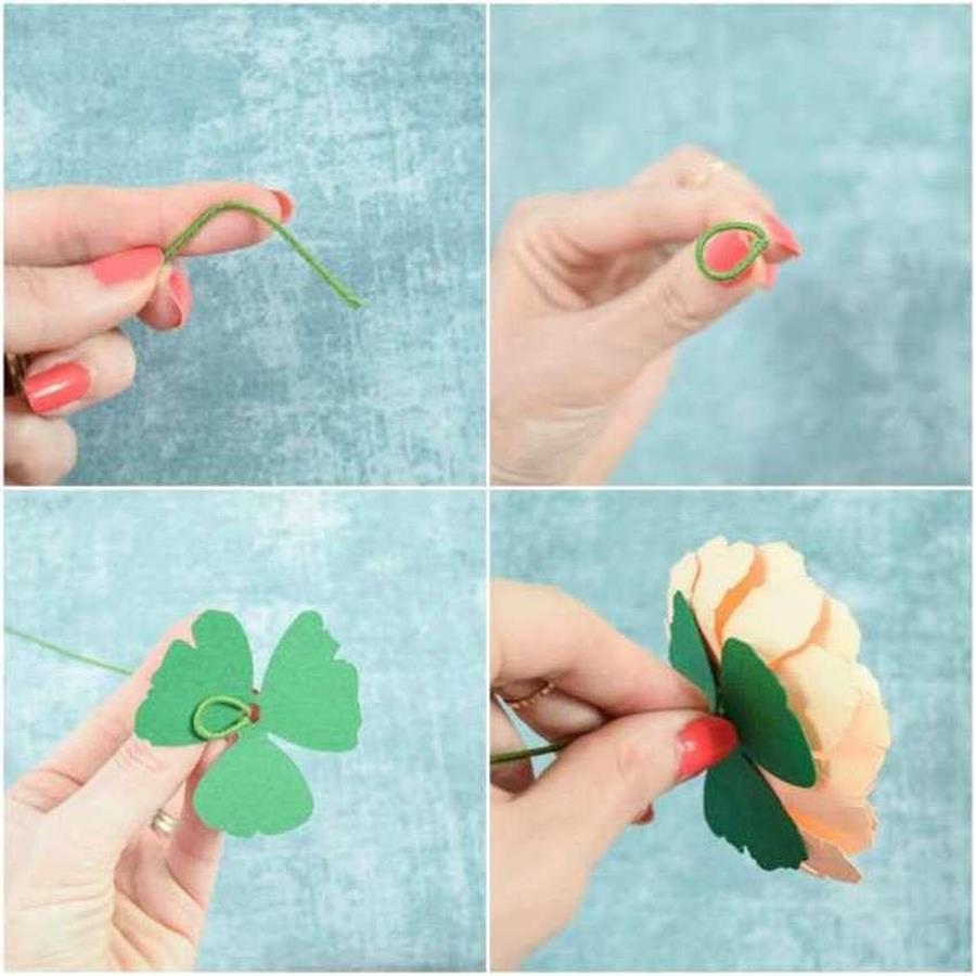 Из зеленой бумаги вырежьте листья. Наклейте их вместе с проволокой на основание вашего цветка.