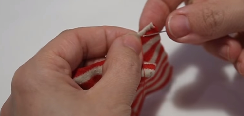 В конце готовится юбочка. Обычно берут ткань 10 на 35 см. Все кроя обрамляют специальным швом. Верхнюю нить стоит слегка ослабить, чтобы проложить там впоследствии две строчки 2-3 мм одна от другой. Связывайте ниточки в узелки, чтобы нигде ничего не развязалось.