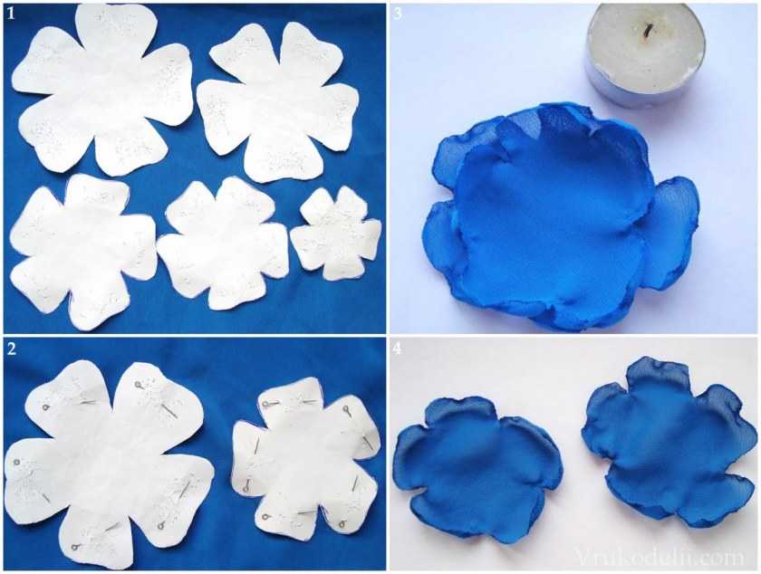 Обычно делается 4 лепестка. Их нужно закруглить маникюрными ножницами и края обжечь над пламенем свечи. Заготовки скрепляются между собой по мере убывания, — на заготовку с большими лепестками накладывается заготовка меньшего диаметра, сшиваются или приклеиваются между собой.
