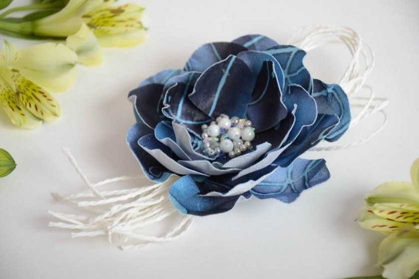 После освоения этих нехитрых техник, не составит труда понять, как можно украсить платье розами из ткани, сделанными своими руками. Опять же, берется тканевая полоска или атласная лента, из нее формируется бутон или способом складывания – развернутая розочка. Ее можно прикрепить на платье сбоку или по контуру выреза. Цветки можно дополнить другими декоративными элементами, такими как бусины, стразы, а можно создать композицию из цветков разных размеров и листков к ним.