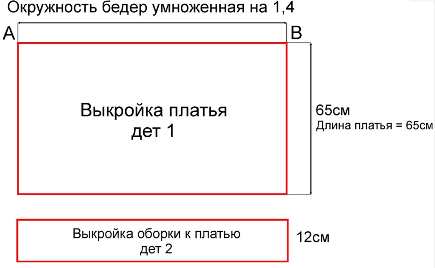 Длина оборочки платьица равняется ширине изделия (отрезок А-В), высота оборочки равняется 12 см без учёта припусков на швы.