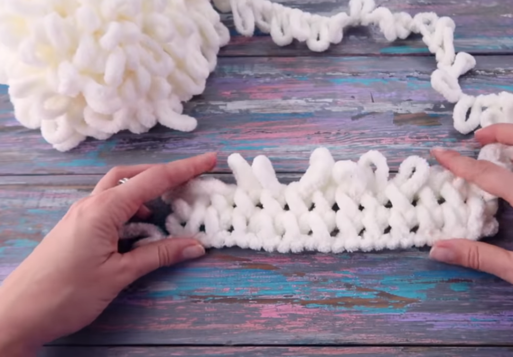 Когда длина достигает 50 см, можно заканчивать работу, получится снуд на один оборот.